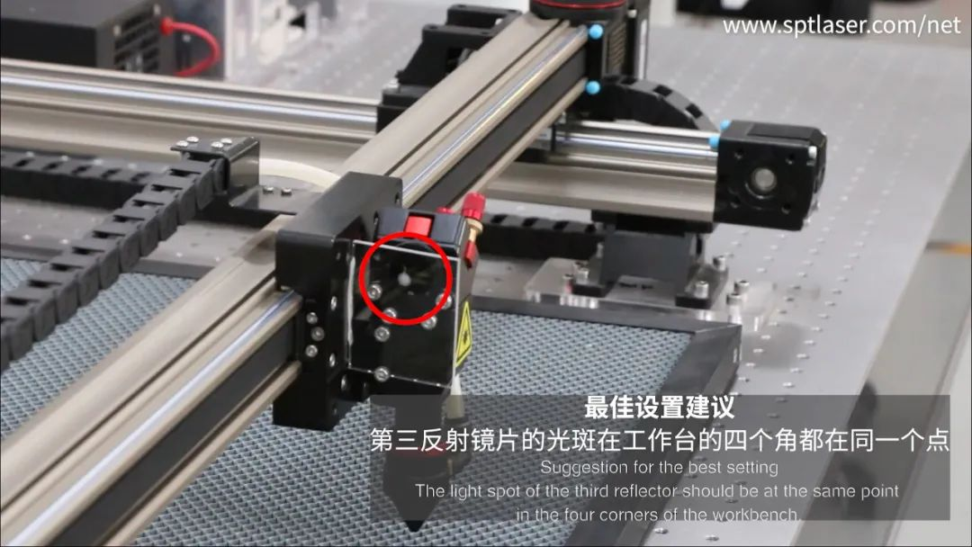 Recommendations for the best setting of the optical path: The light spots of the third reflector all fall at the same point on the four corners of the workbench.