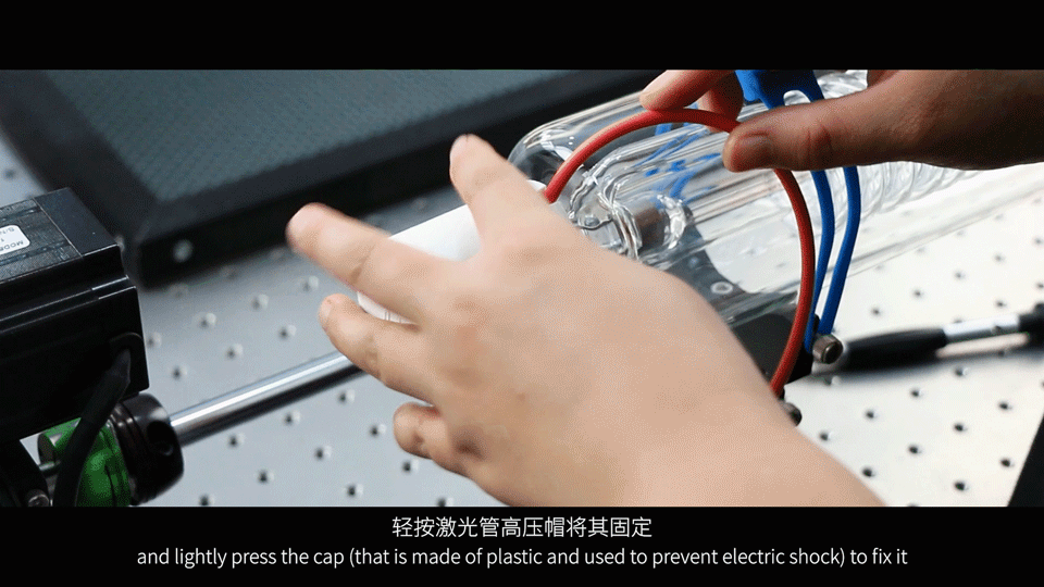 Connect the high voltage line of the laser power supply to the terminal of the high voltage end of the laser tube, and connect the negative line to the terminal of the negative voltage. Lightly press the cap (that is made of plastic and used to prevent electric shock) to fix it.